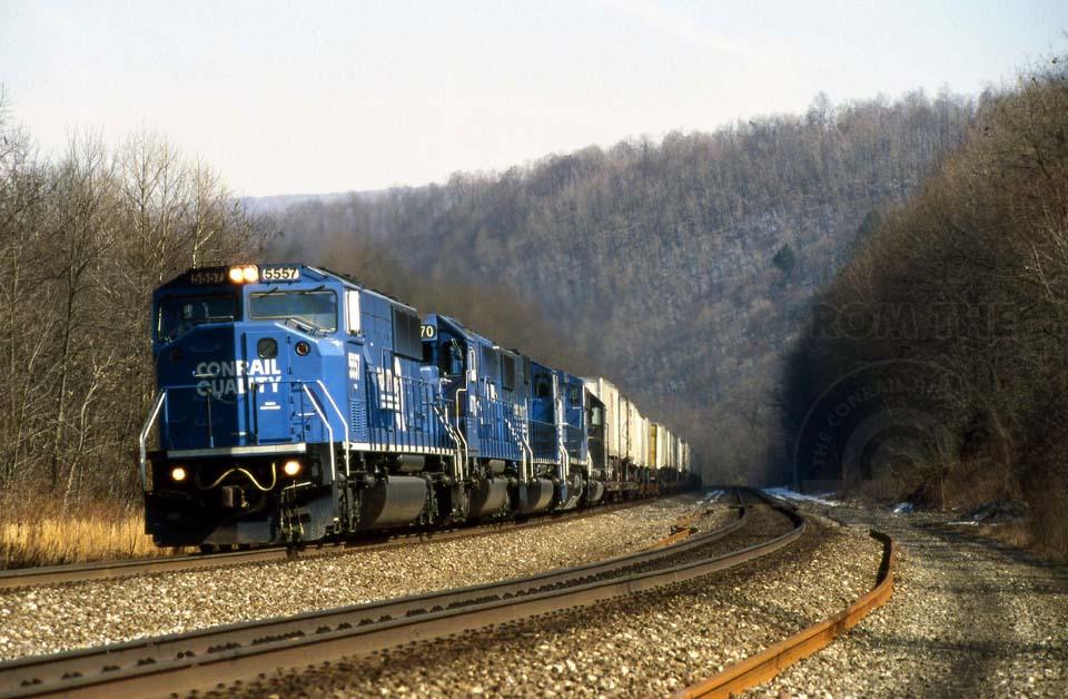 Back in the day when you could simply drive along the right of way and shoot Conrail til you ran out of film, a westbound intermodal charges through the now-illegal to access Pennsylvania countryside.