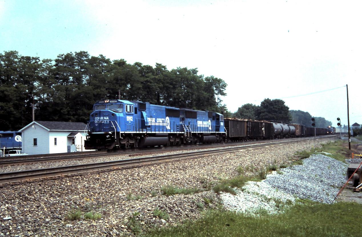 I was set up waiting for an eastbound to show up when I looked behind me to see this westbound freight with CR 5592 and 5632 coming at Cresson, PA on June 25, 1998. Note the westbound off in the distance, as you'll see in another shot, it was RR261