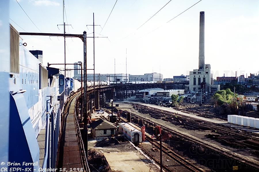 Photo taken with permission. In this conductor's view from the High Line we see a portion of Amtrak's Penn Coach Yard in Philadelphia. Today's EDPI consists of CR 5606, 6029, 6771 (offline), 6179 (offline), and 9 loads by 34 empties for a 1,982 tons.