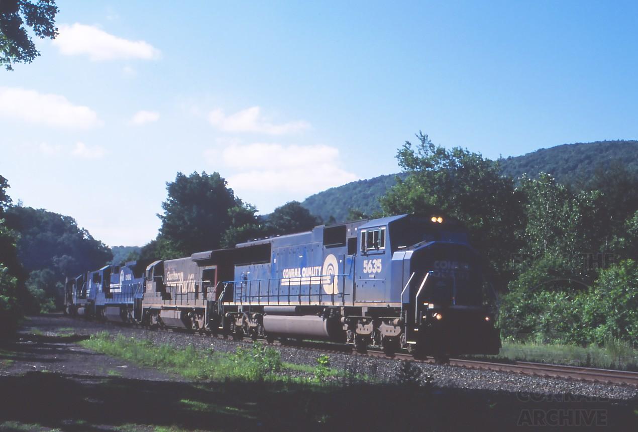 And what are the chances of getting consecutively numbered locos on consecutive trains on the same day? SD60I 5635 with TV9 and a visitor from out west, SP B30-7 7838, at Huntington, MA. at 08:56 on July 5, 1997.