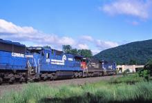 Going away shot of TV9's head end shows the SP 7838, a B30-7, and CR 6031 at Huntington, MA. on July 5, 1997.