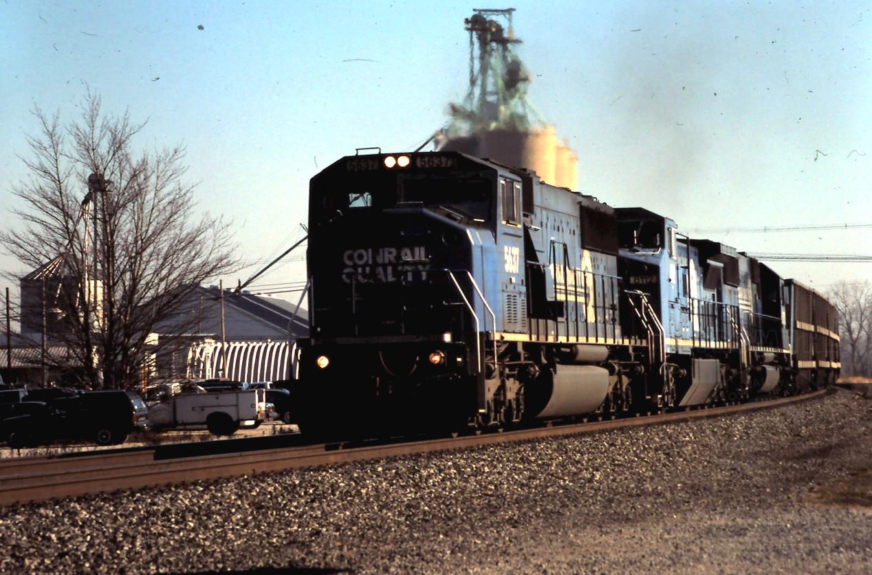 CR 5637, 6112, and a EMD leads UDM-17C westbound thru Oak Harbor, OH on December 9, 1998. This was a solid train of the old DEEX high side coal gons(with the blue end stripes) on its way to Detroit Edison's powerplant in Monroe, MI. Chris Howe photo