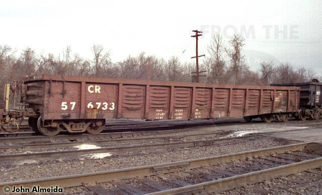 Conrail gondola Class G43A CR 576733 November 1993 ORER description: Gondola, steel, fixed ends, corrugated sides, steel floor, axle spacing 5' 10", truck centers 43' 8", AAR car type code G513, mechanical designaton GB.