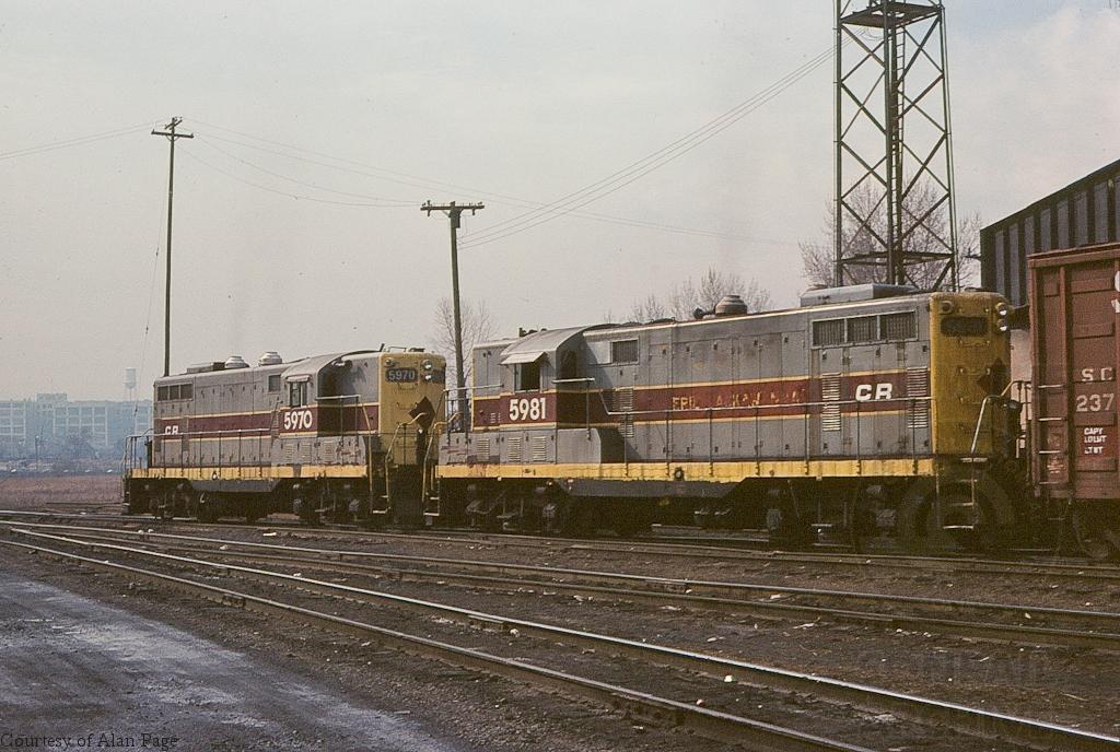 CR GP-7's 5970(ex-EL 1232) and 5981(ex-EL 1243) work at Croxton in March, 1979.