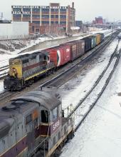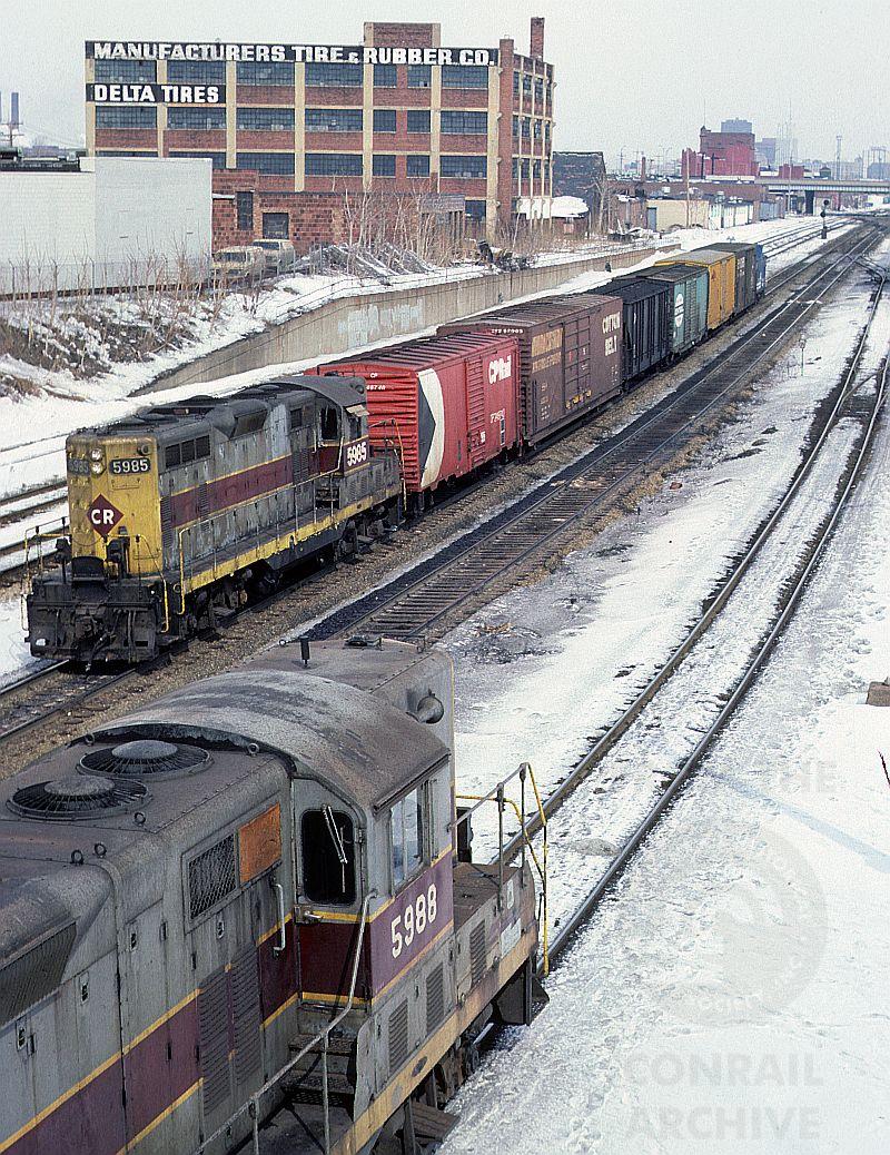 Two locals meet just west of South St, each with a former EL GP-7 up front. The 5995 will head south on the ex PC, the 5988 will cross over to the "EL side" and go west on the former Erie.