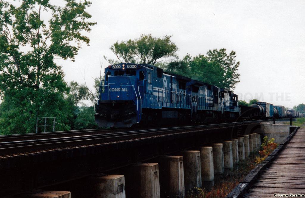 The class unit of Conrail's C39-8 fleet, 6000, leads an eastbound freight across Montezuma Swamp near Fox Ridge, NY
