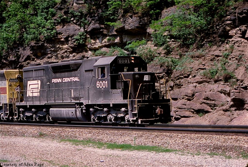 CR SD35 6001 leads SD45 6099 (ex-EL 3634, the last of EL's 3601-3634 series) as they roll piggybacks down Horseshoe Curve on May 22, 1977.