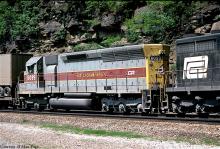 CR SD35 6001 leads SD45 6099 (ex-EL 3634, the last SD-45 of EL's 3601-3634 series) as they roll piggybacks down Horseshoe Curve on May 22, 1977.