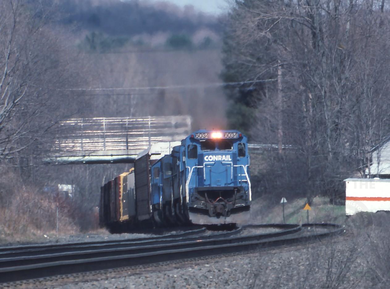 C40-8 6034 leads SEBO over the crest at MP 142 in the center of Hinsdale, MA. on April 29, 1992.