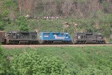 CR SD-40 6300 (ex-PC 6047) leads SD-35's 6044 (ex-CNJ 2505) and 6034 down the Curve on May, 22, 1977.