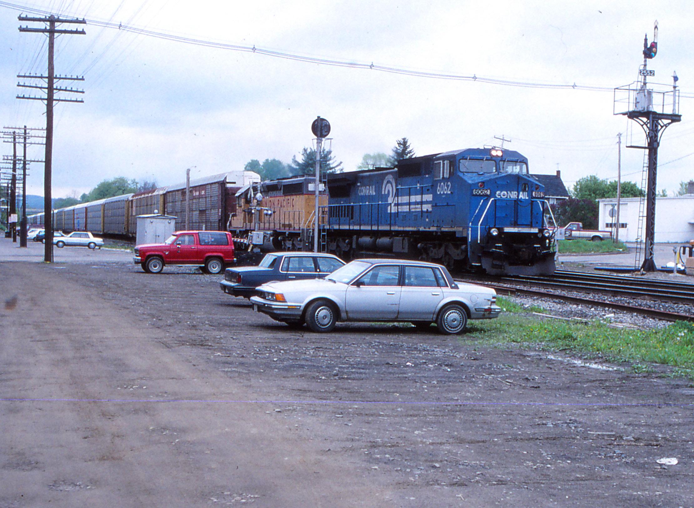 A mismatched set of signals and a mismatched set of power. ML 401 with 89 racks passes between the Type G signal on track 1 and one of Erie's venerable semaphores as it rolls west on a typically gloomy spring day in the Tier.