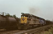 CR SD45 6075 (ex-EL 3610) leads 1977-built SD40-2 6389 with a load of hoppers through Allentown in July, 1978.
