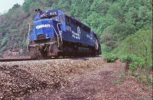 Conrail SD45 6075 (ex-EL 3610) is seen heading west at Horseshoe Curve in 1982.