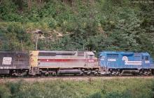 Former PC GP38-2 8075 leads GP35 3655 (ex-RDG), SD45 6075 (ex-EL 3610), and U25B 2549 as they brake a load of piggybacks down Horseshoe in August, 1977.