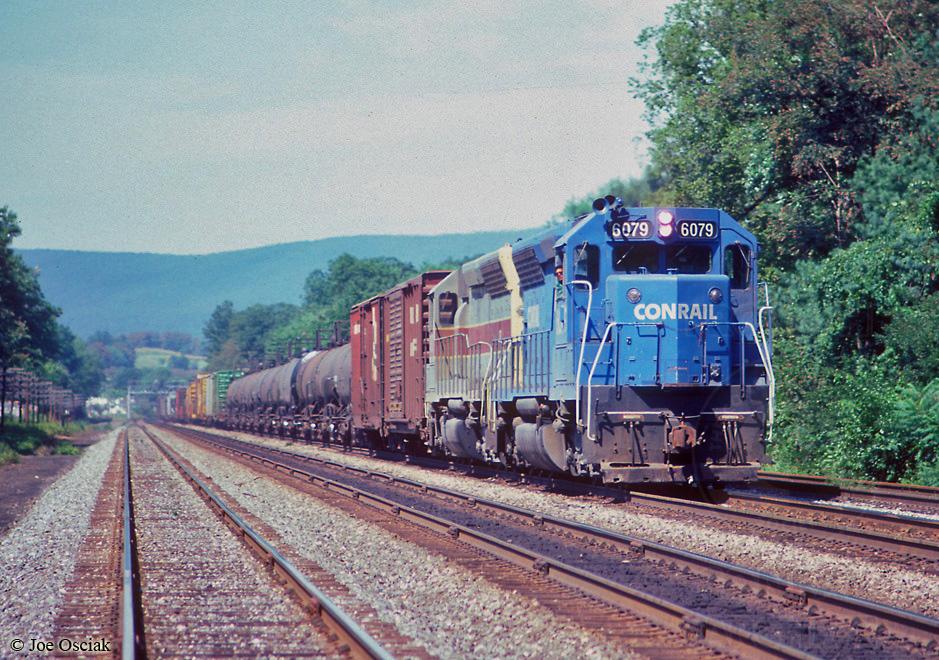 Conrail SD45 6079 is seen leading an eastbound freight through Perdix, PA on 8/19/1981. Notice Track 1 and what would become the controlled siding are still stick rail.
