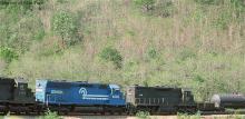 CR SD35 6037 leads SD45's 6080 and 6158 down the Curve on May 22, 1977.