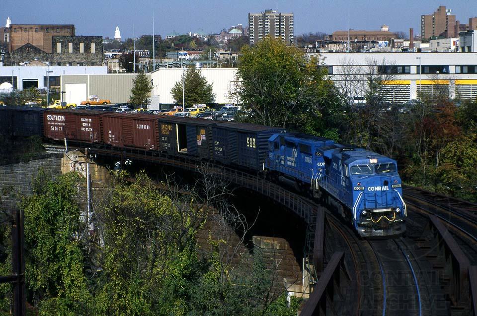 After a brisk walk to a perch along the North Avenue bridge (looking over my shoulder the whole time), I was rewarded with a Conrail run-through over the once-electrified B&O Belt Line. I'd try this shot today, only with a platoon of Marines! Ah, Charm City.