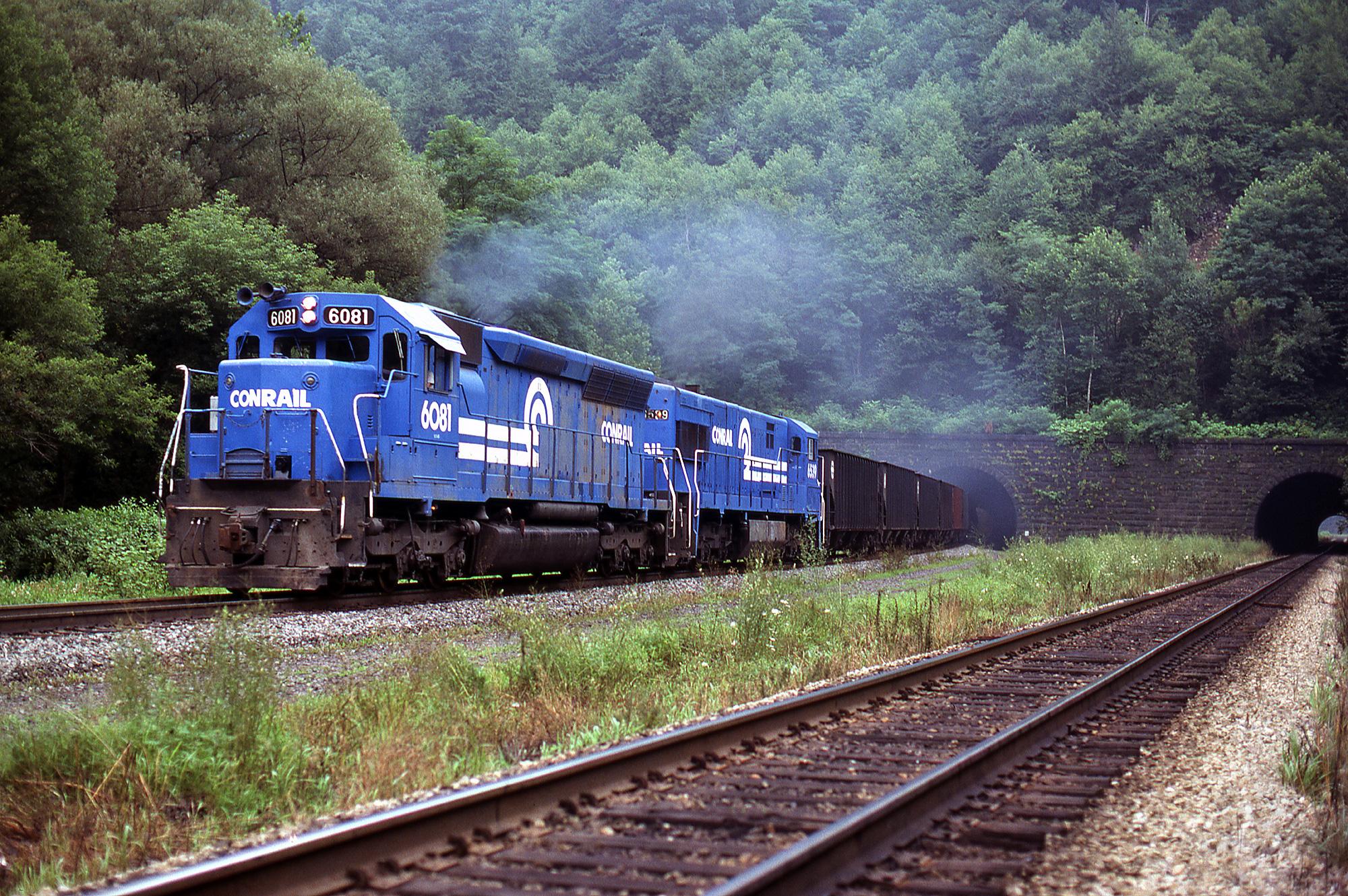 A WB empty hopper train exits Spruce Creek Tunnel, Spruce Creek, PA on 8/5/78 with SD45 No. 6081 and a U28C.