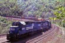 Conrail SD45 6091 (ex-EL 3626) and SD40 6286 (ex-CNJ 3062) are shoving a westbound freight around Horseshoe Curve in 1984.