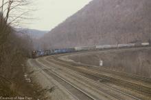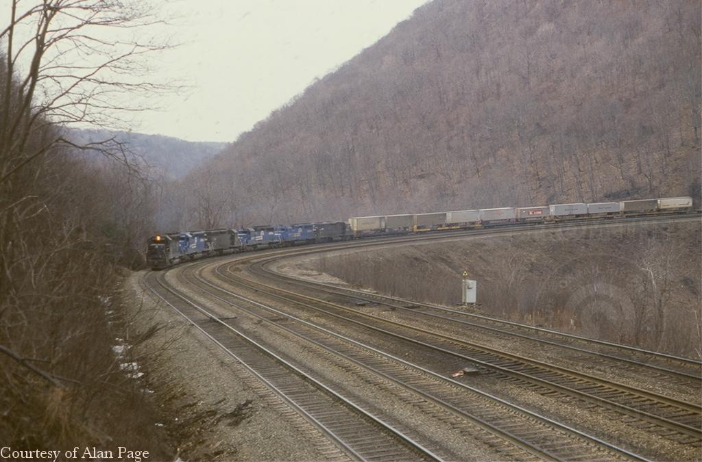 An ex-PC SD45 leads a sextet of black and blue power as they pound up Horseshoe Curve in March, 1981.