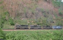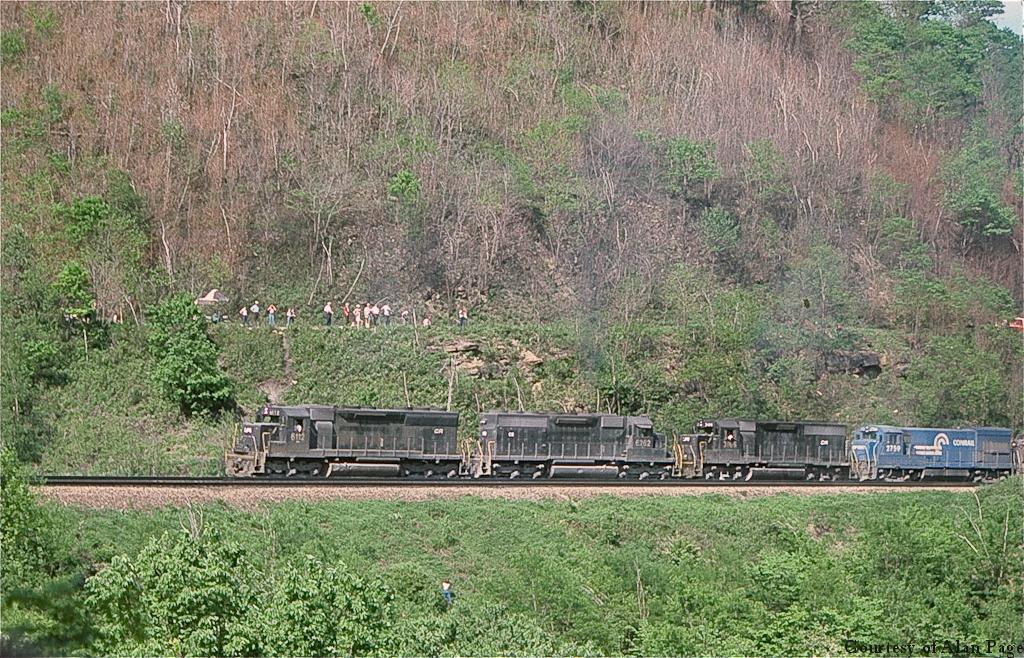 SD45 6112 leads six other units, 6262, 3165, 2759, 1755, 3065, and 3071, up the Curve on May 22, 1977. Railfans were gathered on the hill behind awaiting a scheduled run up the Curve by former-RDG 4-8-4 #2102.