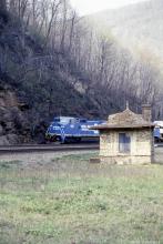 C40-8 6120 leads a westbound around Horseshoe Curve in 1990.