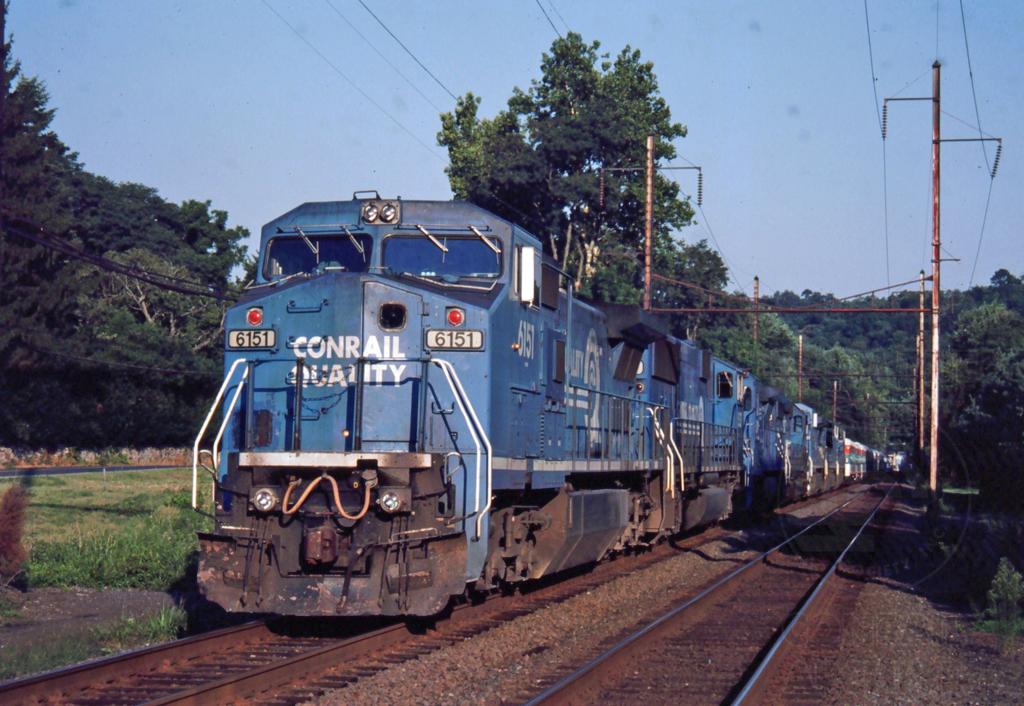 Conrail C40-8W 6151 is seen powering a CIR circus train with the James Strates Carnival Train in tow at Columbia, PA in July, 1998. JB Kerr Photo