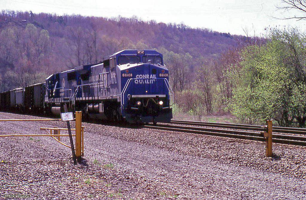 Conrail C40-8W 6156 is seen leading a westbound ballast train at Warrior Ridge, PA in 1993.