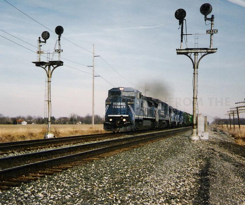 A westbound Conrail freight with the 6169 on the point going past the classic NYC signals at Delta, OH on March 12, 1996. These signals were replaced not too long after this picture was taken.