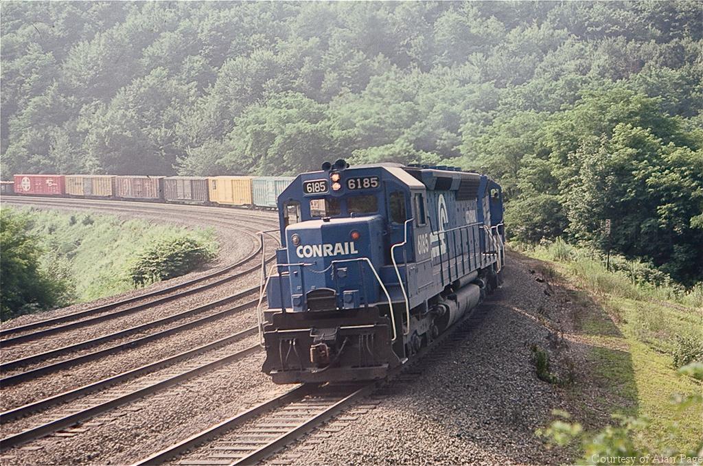 Former PC SD45 6185 pushes hard up Horseshoe Curve in August, 1979.