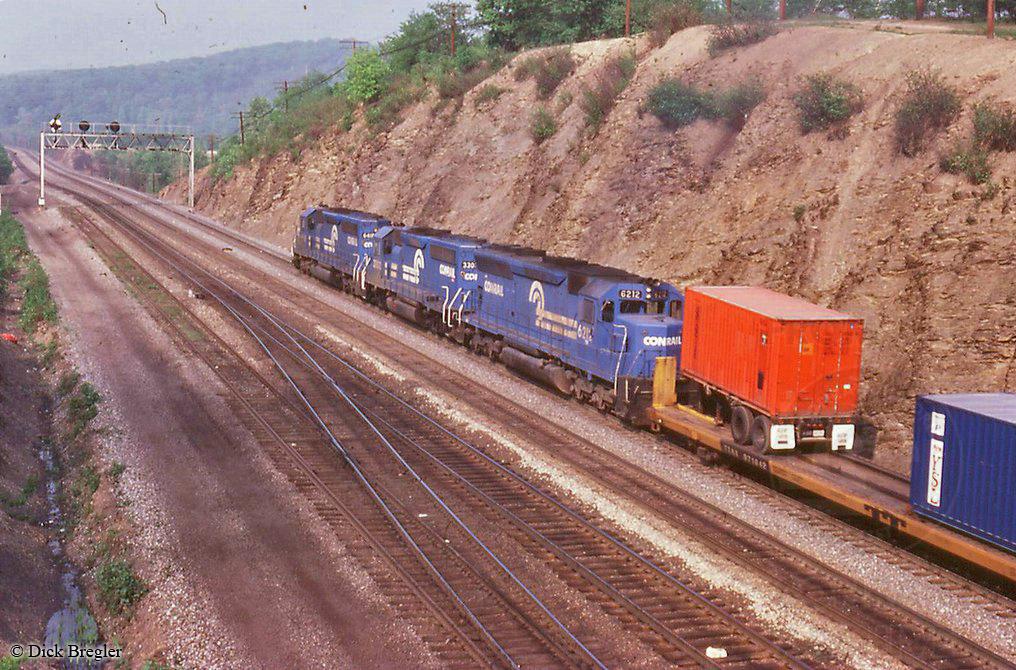 Conrail SD45 6212 (ex-PC 6212) is seen trailing on an eastbound TV train just west of CP-Slope in Altoona in 1982.