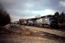 CR 6214 leads a collection of power including a CRL GE and a UP EMD at Greencastle, IN on January 24, 1998.