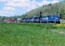 TV 20 passes the home signal at CP Swain as it heads for Hornell with 45 platforms and 33 COFC. This was a new 12,800 foot siding installed when the line was single tracked a couple years prior, allowing stack trains to meet. Conrail tended to run long stack trains, sometimes over two miles. This was quite an undertaking in the days before DPU's, though the crews managed to get over the road, including several good climbs, without incident.