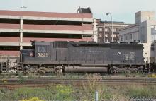CR SD-45 6225 shows PRR roots with two Keystones as part of a quartet of SD's pulling piggybacks through Altoona in August, 1977.