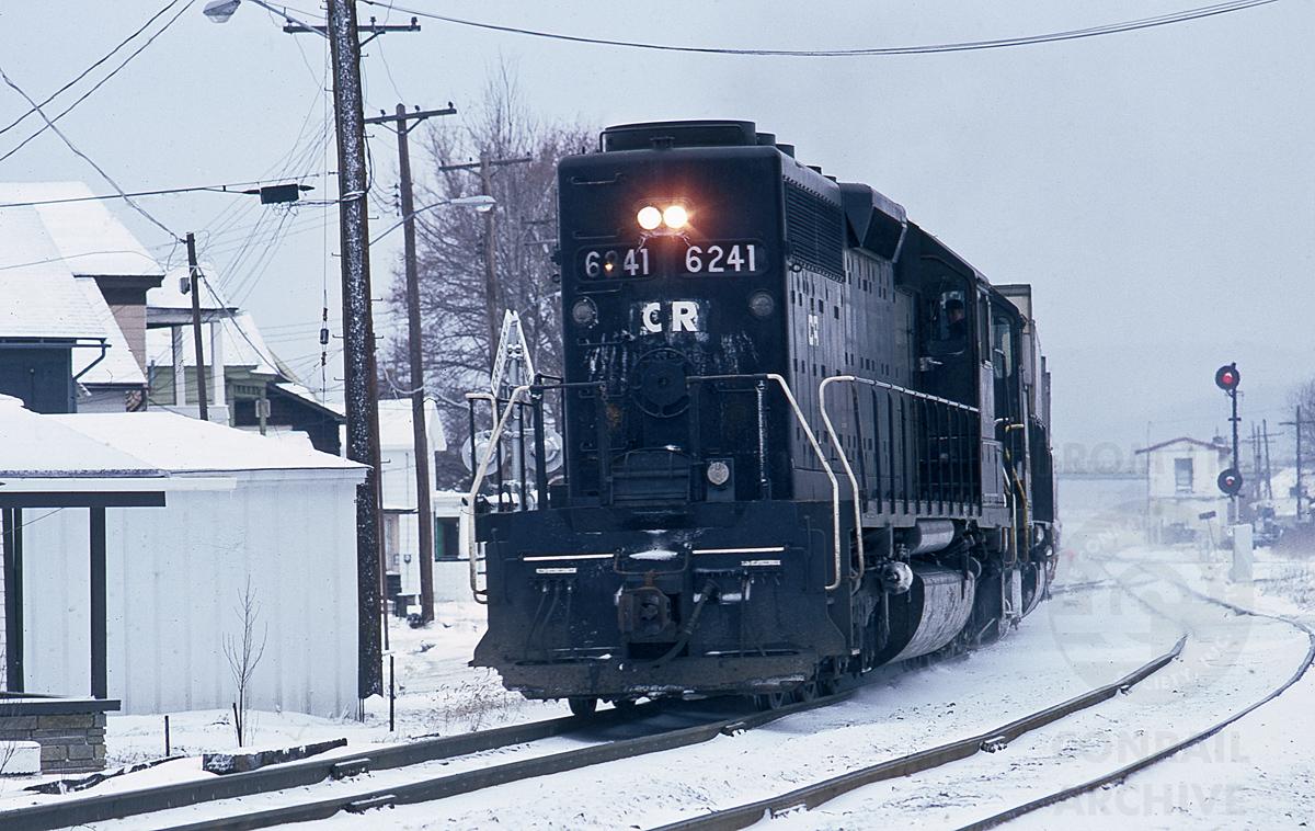 TV-77 leaves Hornell, NY with 6241 running long hood forward. CASS Tower is visible behind the signal.