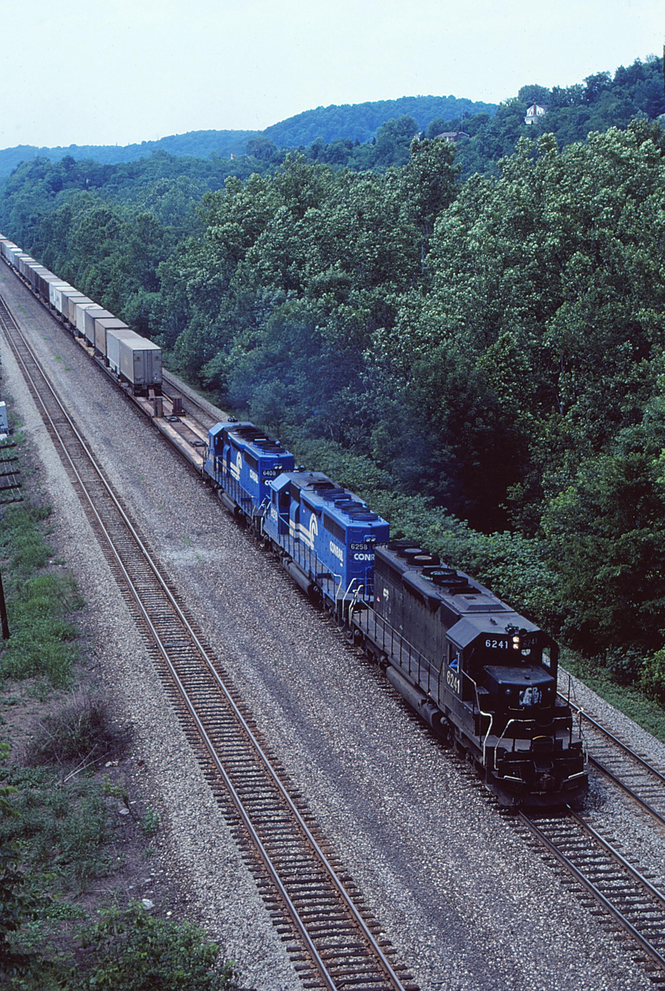 SD40 6241 leads a westbound Trailvan at Larimer, PA on the Pittsburgh Division.
