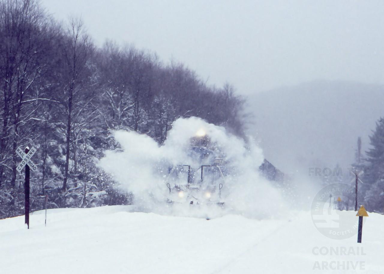 TV-6, with the 6244 in the lead, punches through the snow berms at Ballou's crossing in Washington, MA. on Dec. 31, 1997.