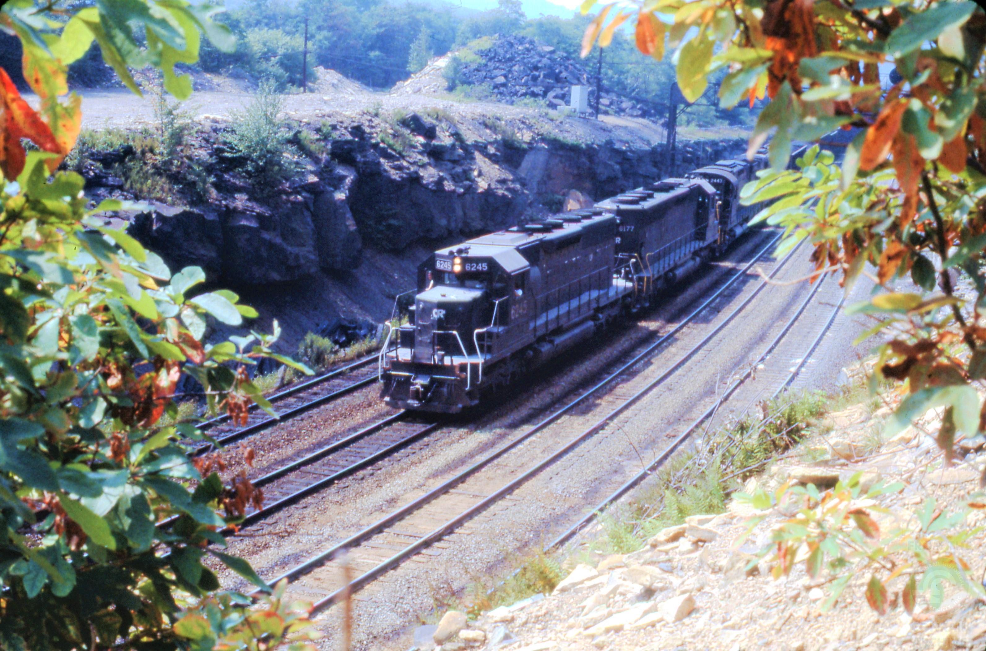 Westbound freight with ex- Penn Central SD-40 #6245; #6177, Alco #2443 & #2407 at Benny Curve, September 12, 1977