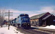 TV-78 passes the ex Erie station at Alden, NY heading to Kearny, NJ behind C40-8W 6258 and GP40-2s 3335 and 3342.. 3/1998