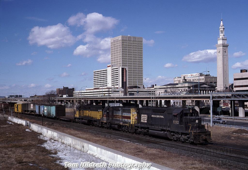 Springfield, Massachusetts was the most significant rail freight gateway in New England throughout the Conrail era. In this shot we see train M-7 southbound around noon on 2 March 1977. In this atypical lash-up PC 6262 is an SD40, EL 2563 is a GP35, and CNW 924 is an SD40.