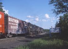 Class unit 6800 has the trail position past the summit sign in Hinsdale, MA. on June 22, 1980.