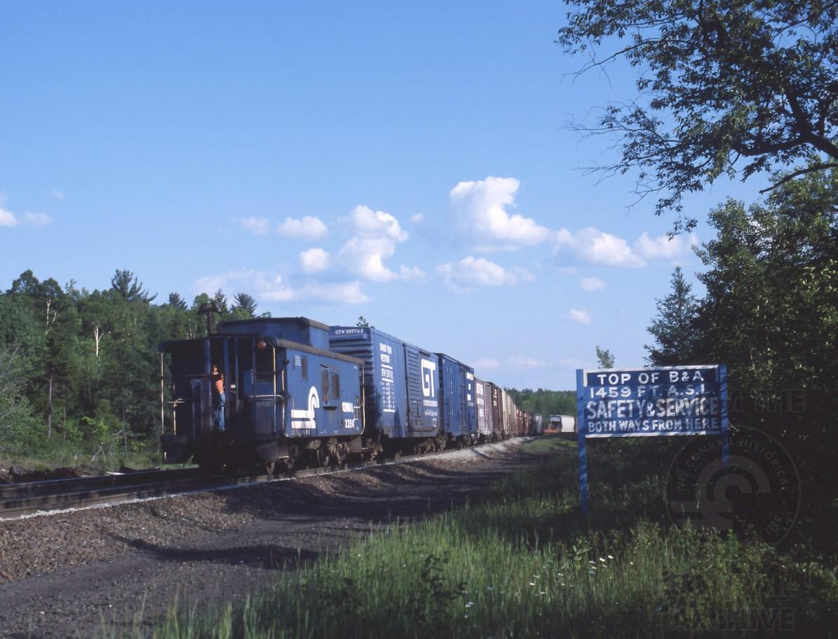 N8B buggy 23514 tagging along at the rear of the extra 6265 east at Hinsdale summit on June 22, 1980.
