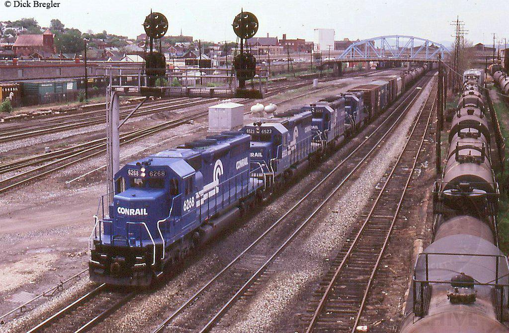 Conrail SD40 6268 and SD40-2 6523 are leading an eastbound mixed freight at CP-Works in Altoona, PA in 1981.