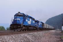 CR 6271 and 1933 lead a freight west at Duncannon, PA on 8/4/84.