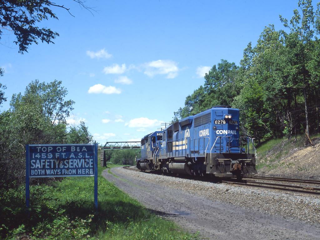 Coupled together, both of the Washington hill pushers make a light engine move eastward past the summit in Hinsdale, on July, 1, 1982. ConRail had two independantly operating pushers assigned to Washington Hill until the time this photo was taken. SD40/40-2's were the most common units assigned, but SD45's and various 6 axle GE's also did duty shoving the tonnage over the hill. When not actually working, the units could be found "lounging around" in Chester or Pittsfield.