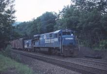 U33-C 6555 lends a hand to the extra 6280 west at MP 127 in Chester, MA. on June 13, 1979. Note the fairing on the leading edge of the radiator "wings", a feature unique to GE's U33 models.