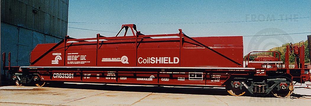 Previous Next Here we see CR 631361, a new CoilShield coil steel car, fresh out of the paint booth. Date unknown. Photo By Builder's Photos Equipment Type Class G52U Conrail Number 631361 Collection CRHS Conrail Photo Archive Contributions