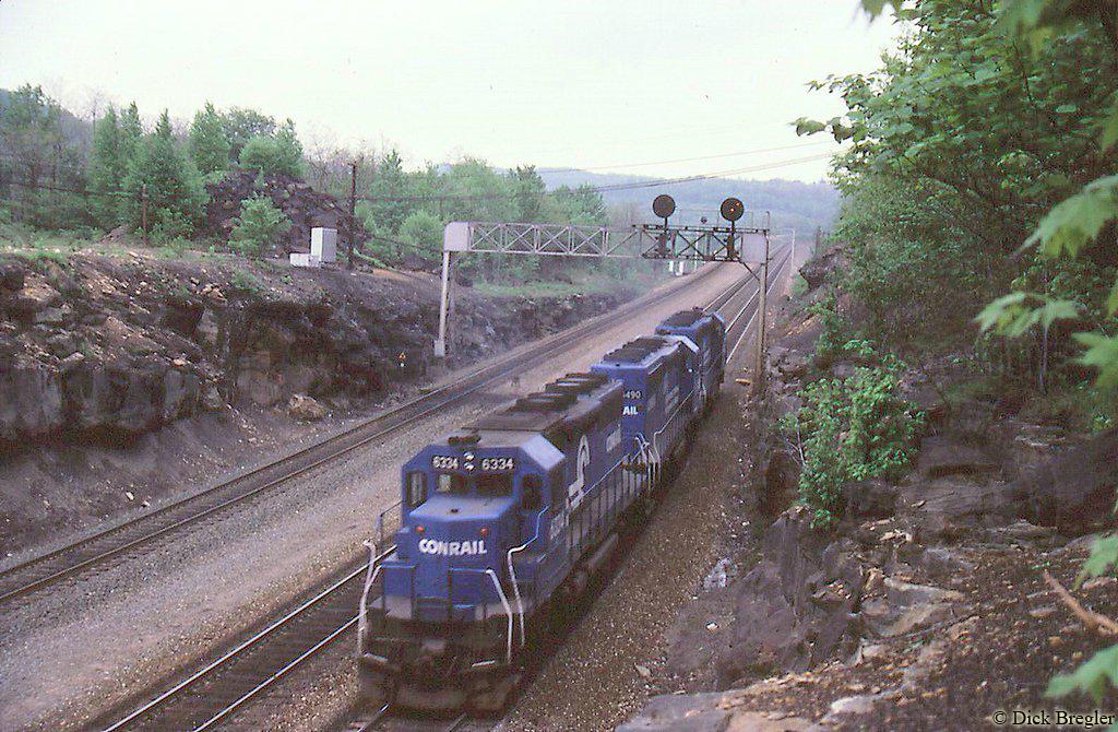 Conrail SD40-2 6334 is seen trailing on a westbound helper move at Bennington Curve in 1986.