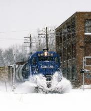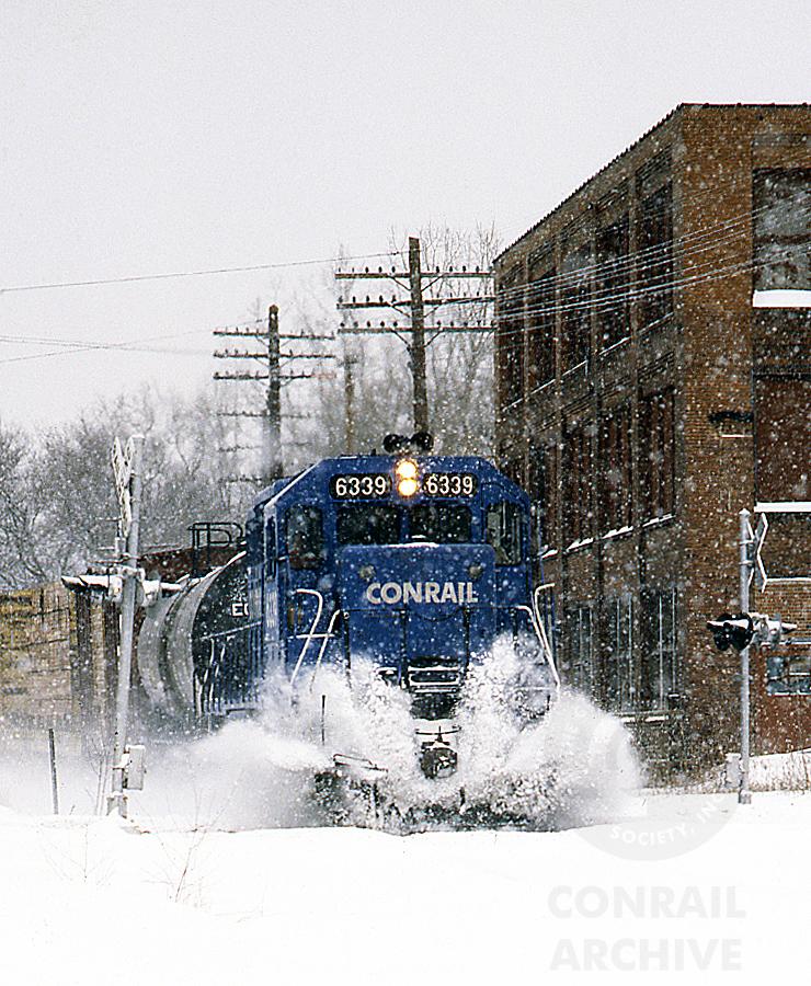 ELOI comes off the "hill" and into Hornell on the line from Meadville. There is a lot of snow plowed up at the West Street crossing as the single SD-40 busts thru the drift.