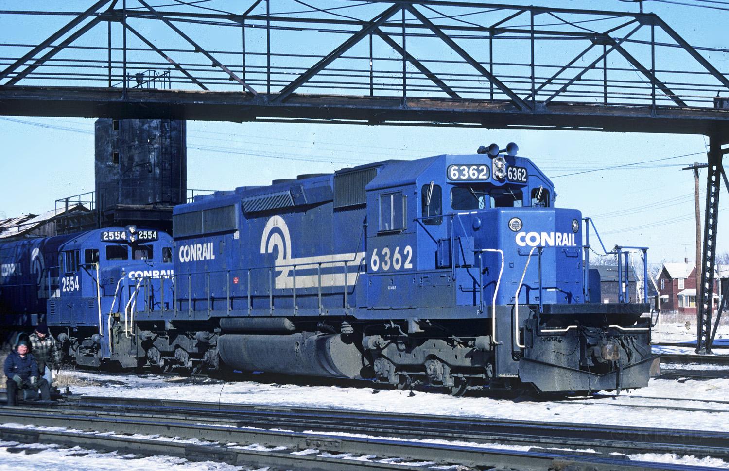 A crew waits for a westbound as SD40-2 6362 idles at the ready track 1/15/79